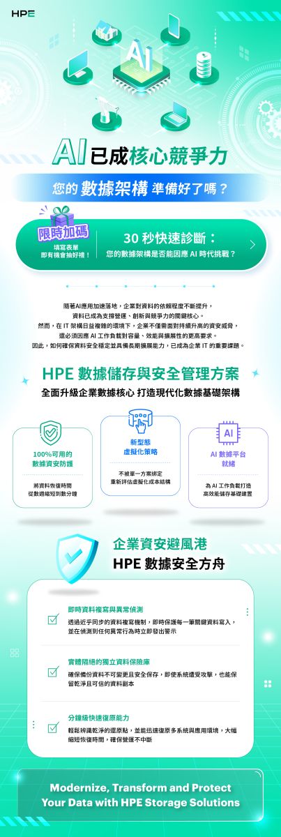 隨著 AI 應用快速發展,企業對資料平台的依賴持續提升 從日常營運、虛擬化環境到 AI 工作負載,資料架構不僅要穩定可靠,更必須具備高度安全性與未來擴充能力 HPE 數據儲存與安全管理方案,協助企業建構更現代化的資料核心,全面提升效能、韌性與管理效率。